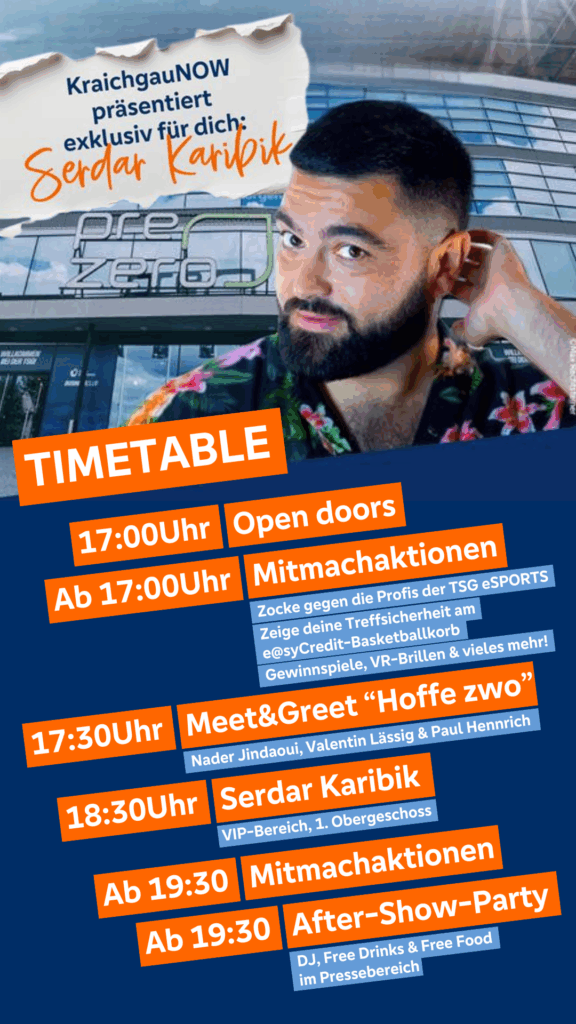 Am 11. November 2025 um 17 Uhr steigt unser erstes KraichgauNOW-Event. Und das in einem ganz besonderen Rahmen: Wir laden euch in den exklusiven Bereich der PreZero Arena in Sinsheim ein. Erlebt mit uns einen spannenden und unterhaltsamen Abend: